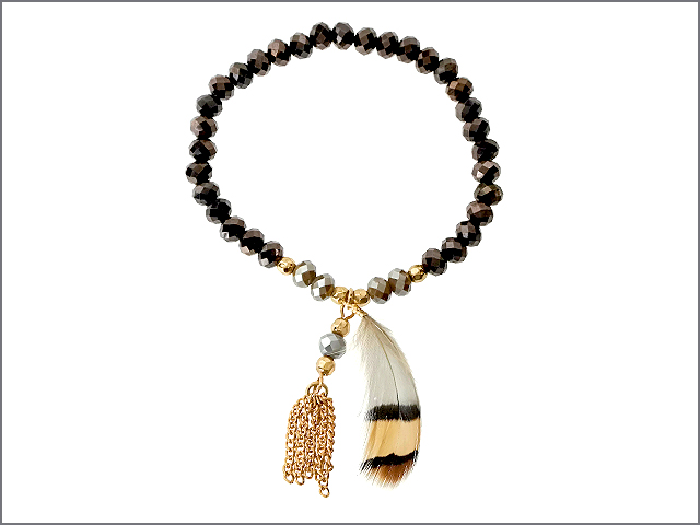 Tags: Bracelet, Bead, Charms, Feather, Stretch, Black, Worn Gold, Stretch