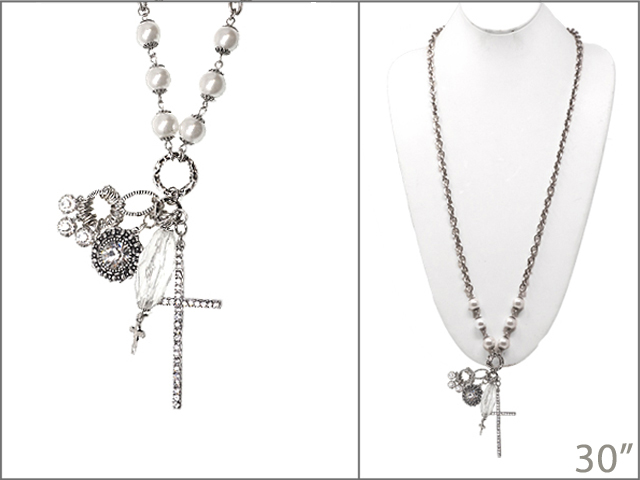 Tags: Necklace, Charms, Cross, Pearl, Themed, Silver Burnish, Long