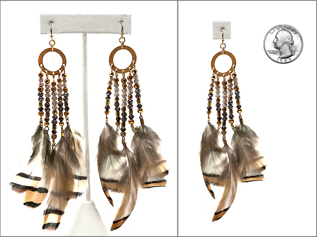 Tags: Earrings, FASHION, Feather, Gray, Matte Gold, Fish Hook, Bead